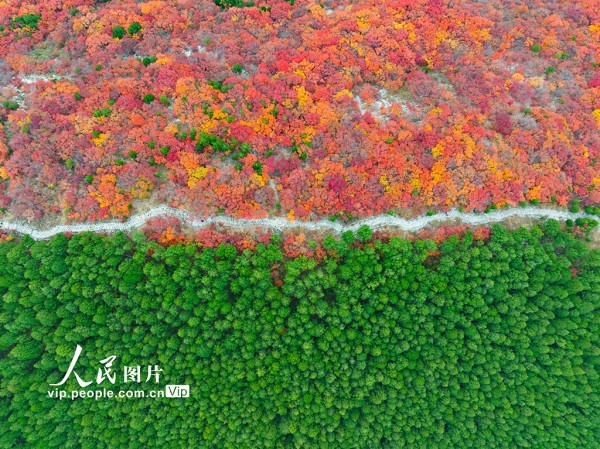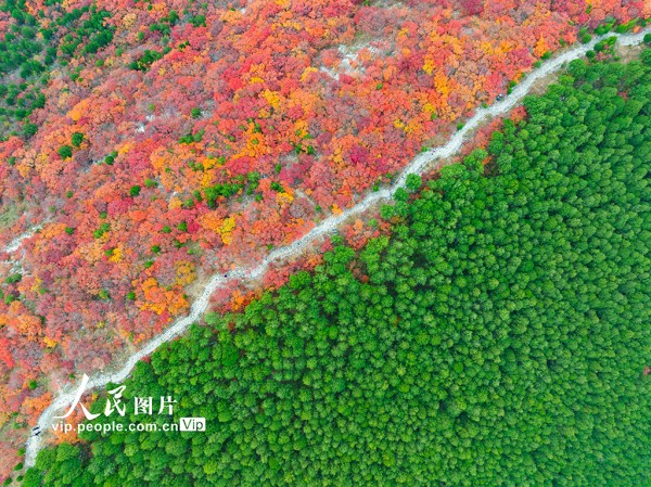 2025年10月30日,山东省济南市蝎子山呈现“半山红叶半山青翠”的独特景象,吸引不少游人前来游玩。徐舟摄(人民图片网)