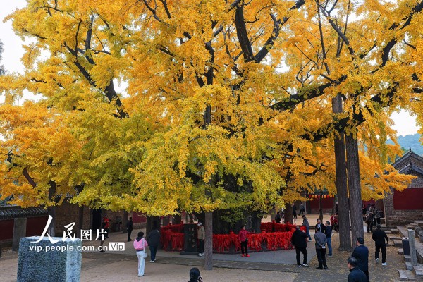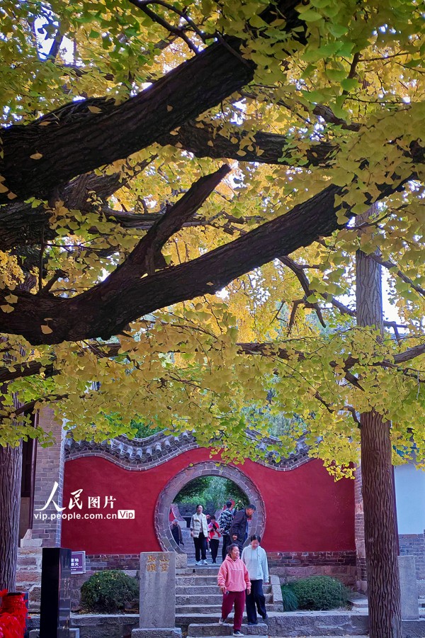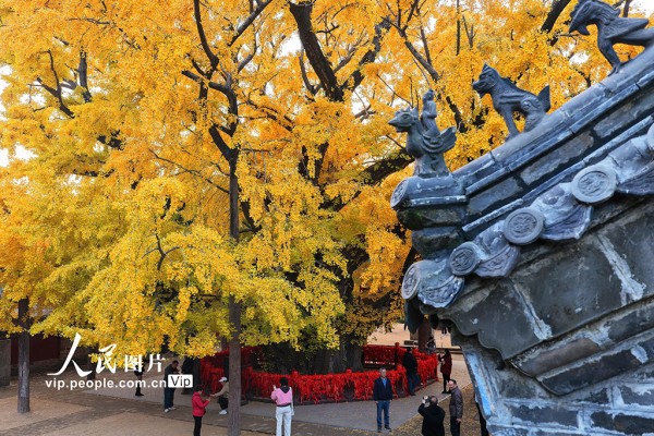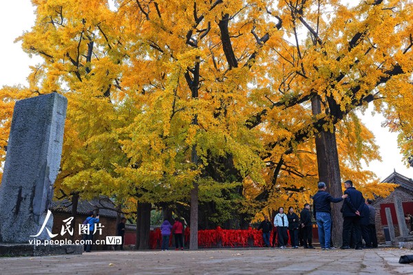 连日来,山东省日照市莒县的“天下第一银杏树”迎来最佳观赏期,满树金黄的叶片在阳光下熠熠生辉,吸引众多游客前来观赏留影。郑培波摄(人民图片网)