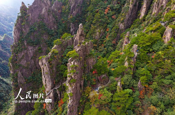 深秋时节,安徽黄山风景区西海大峡谷秋色绚烂,峰林间点缀着橙、红、黄交织的彩叶,与苍劲奇松、嶙峋怪石相映成趣,为雄伟的黄山增添诗意与柔情,吸引游客驻足观赏。施亚磊摄(人民图片网)