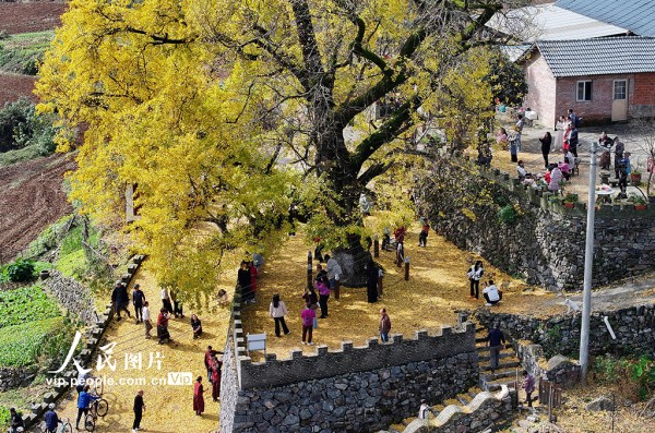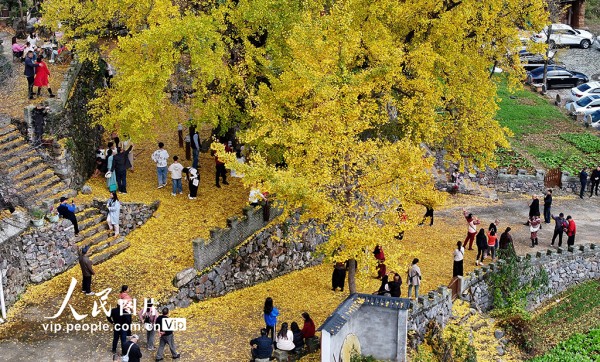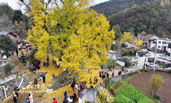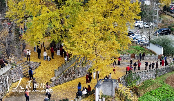 2025年11月9日,湖北省襄阳市谷城县茨河镇胡家泉村,千年古银杏树身披“金装”,吸引众多游客前来观赏。王虎摄(人民图片网)