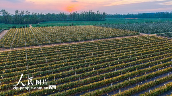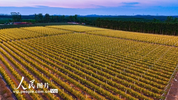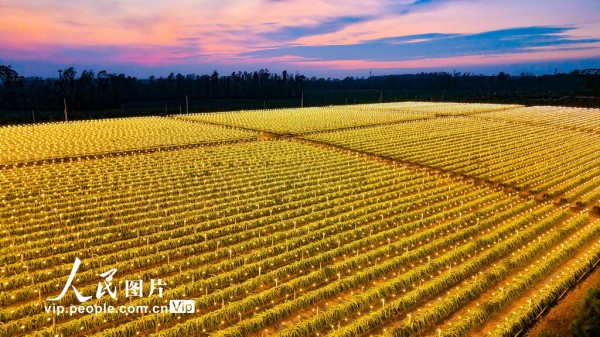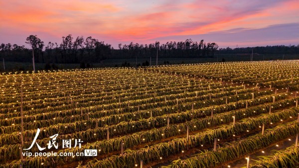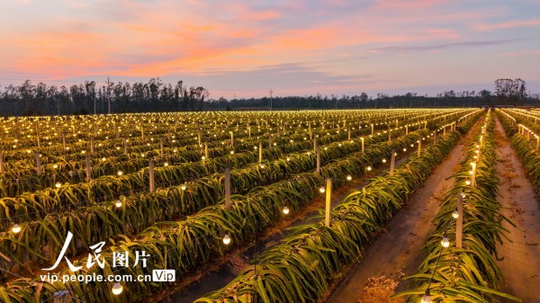 立冬时节,北海市合浦县石湾镇清水村火龙果种植基地利用现代化科技在夜间给火龙果补光,促进火龙果的光合作用,让火龙果拥有良好的生长环境,进一步提高火龙果产量,增加出果批次,助力果农增产增收。林启波摄(人民图片网)