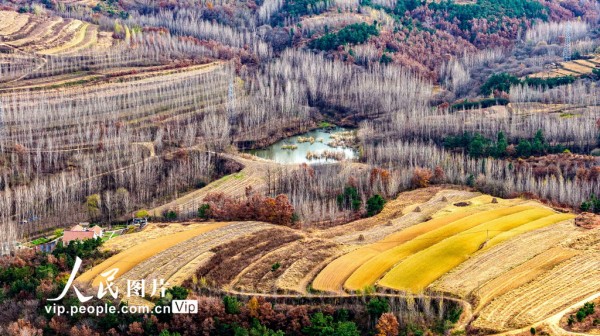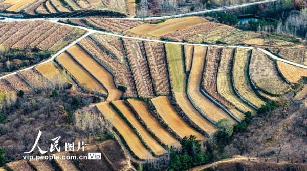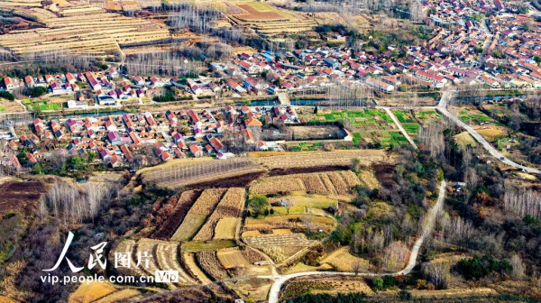2025年11月17日,山东省青岛市西海岸新区六汪镇,绵延的梯田层层叠叠,与村庄交相辉映,构成一幅冬日画卷。韩加君摄(人民图片网)