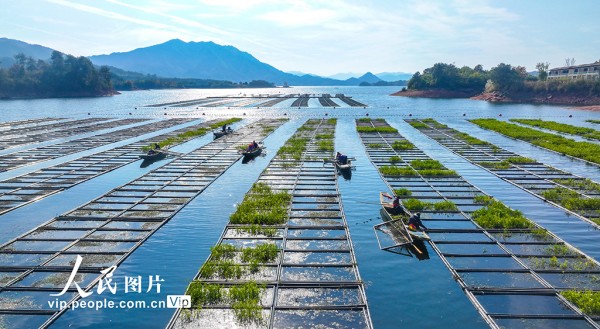 2025年11月18日,浙江省杭州市淳安县千岛湖镇坪山水域21亩生态浮岛上,工作人员正在进行冬季田间管理,清理空心菜、修整加固浮床,为换种冬季水芹做准备。