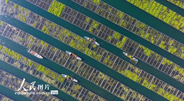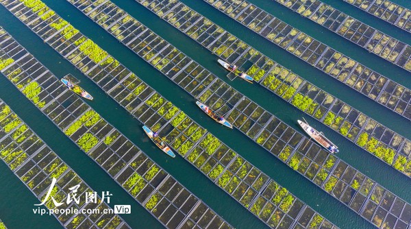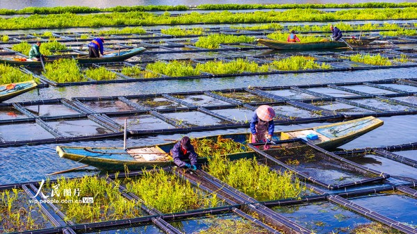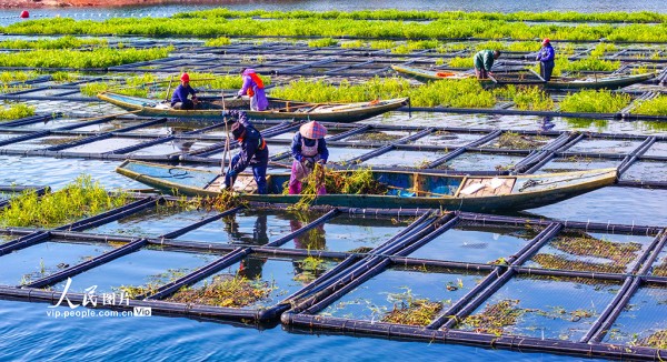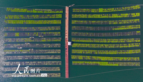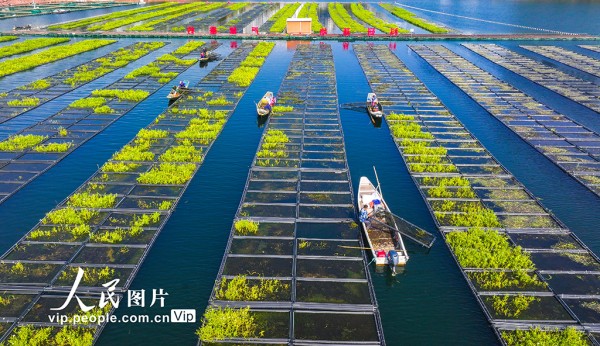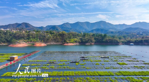 淳安县为保护千岛湖优质水质,积极应用生态浮岛无土栽培技术,筛选根系发达、维护简便、脱氮除磷效率高的水生及驯化陆生植物种植于水面,通过植物密集根系的吸收作用增强水体净化能力,持续提升千岛湖水质。余剑锋摄(人民图片网)