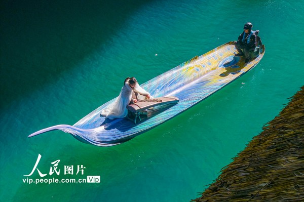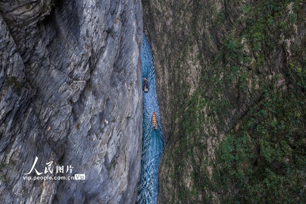 2025年11月29日,湖北省恩施土家族苗族自治州鹤峰县容美镇屏山峡谷景区,阳光穿过峡谷形成“一线天”光带,游客乘船赏景,如行画中。杜维摄(人民图片网)