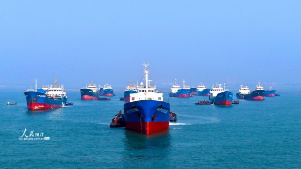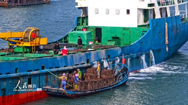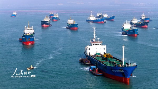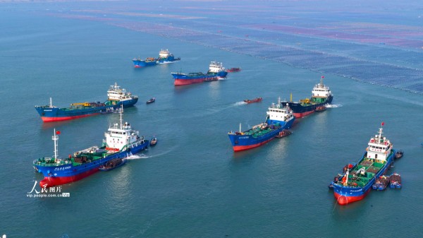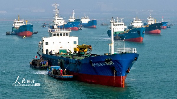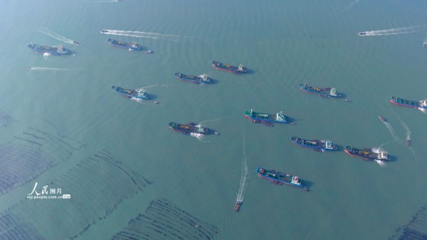 2025年11月30日,山东省荣成市爱伦湾鲍鱼港海域,众多装载鲍鱼苗的南方船只有序排列,养殖工人将鲍鱼苗装船运往福建海域继续养殖,场面十分壮观。杨志礼摄(人民图片网)
