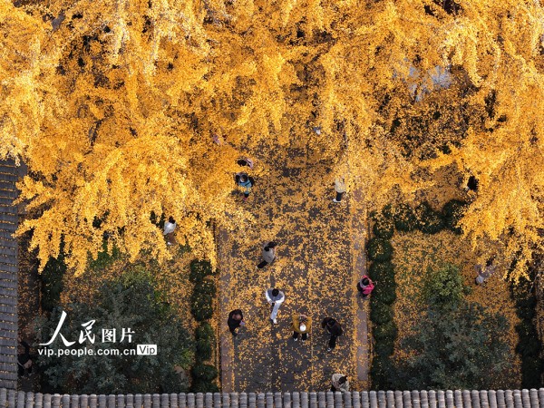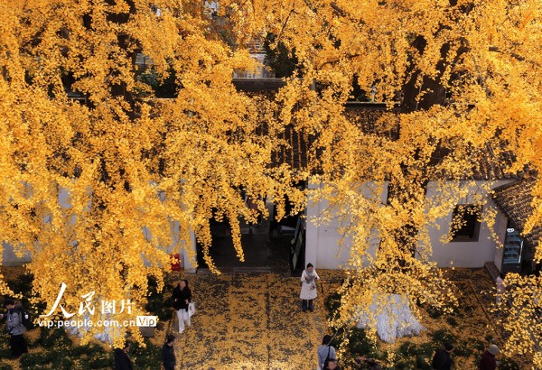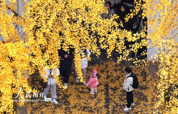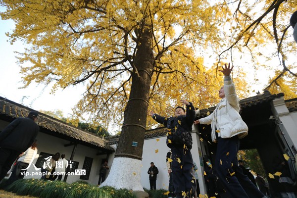 初冬时节,江苏扬州史可法纪念馆内银杏树迎来最佳观赏期,吸引众多游客前来观赏留影。孟德龙摄(人民图片网)