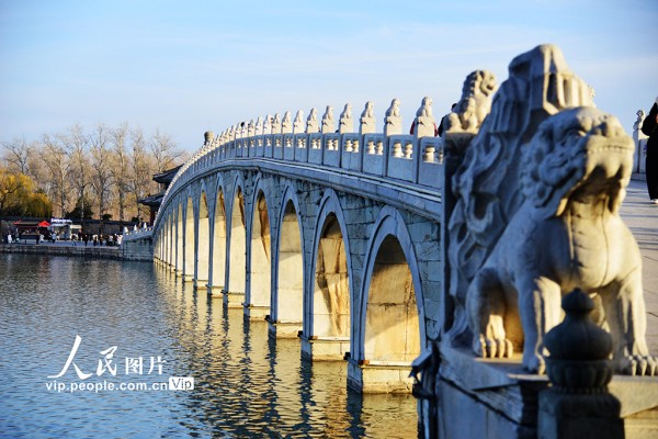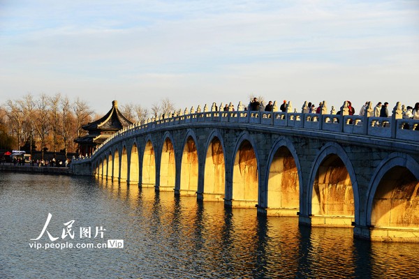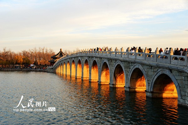 2025年12月1日,日落时分,北京颐和园十七孔桥再现“金光穿洞”景观。低角度夕阳光线将十七个桥孔逐一染成璀璨金环,犹如被一支神笔以金线连贯绘就。“金光穿洞”景观吸引众多游客和摄影爱好者观赏、拍照。樊甲山摄(人民图片网)