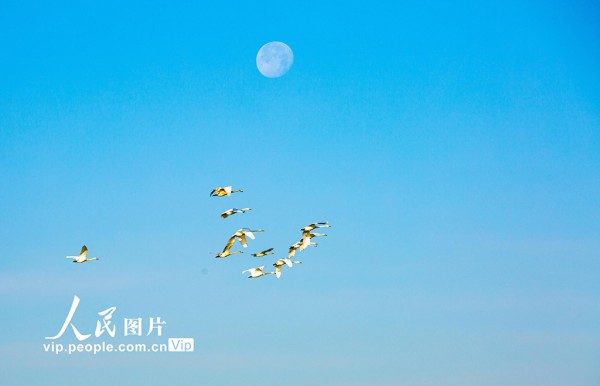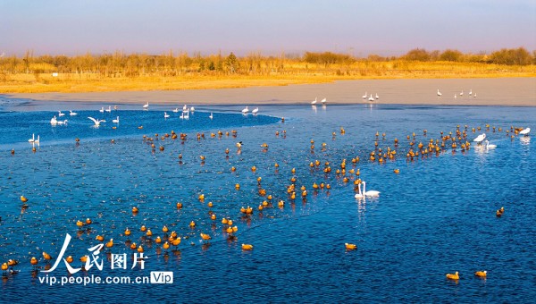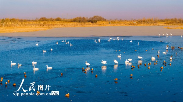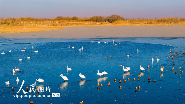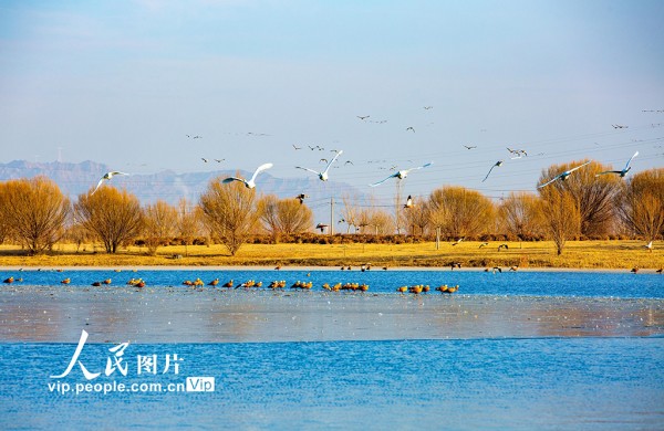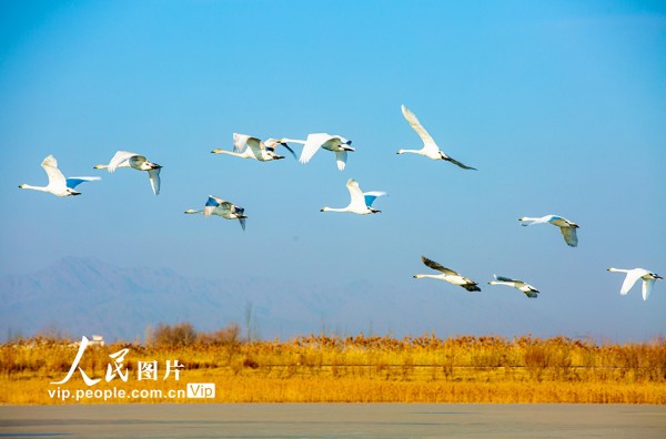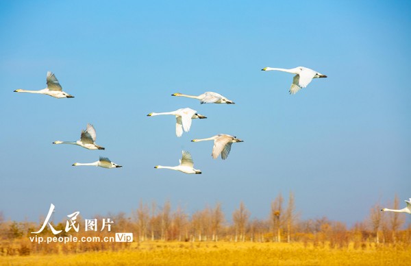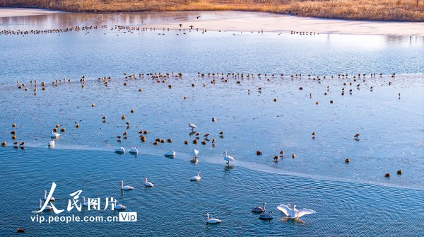 2025年12月7日,甘肃省张掖国家湿地公园,越冬的大天鹅游弋、觅食、飞舞,构成冬日湿地的迷人景致。杨永伟摄(人民图片网)