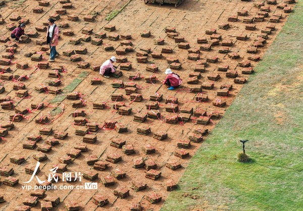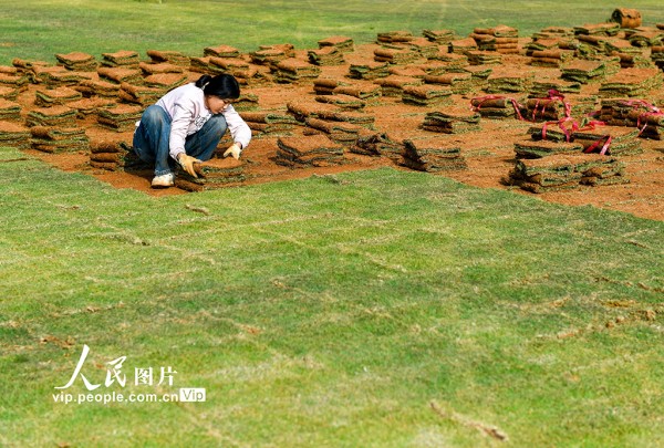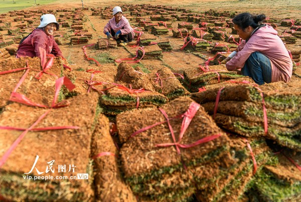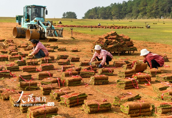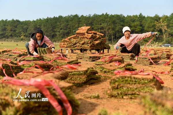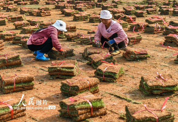 近年来,道县充分利用荒山、荒坡等土地资源,发展绿化草皮种植产业,通过土地流转、务工等方式,带动当地农民就业增收。蒋克青摄(人民图片网)