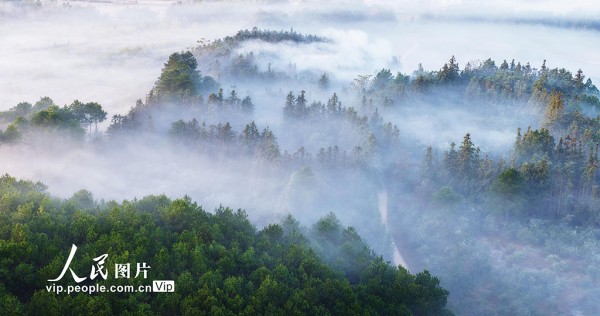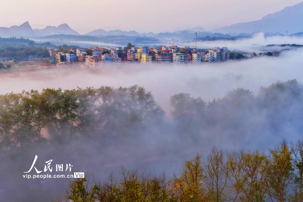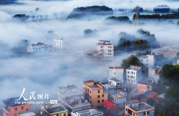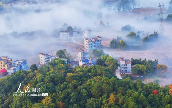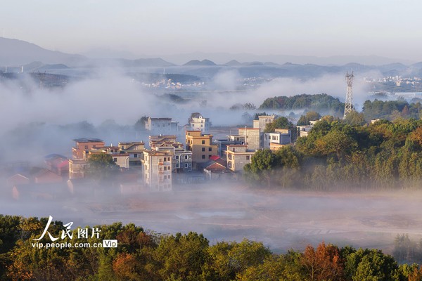 2025年12月8日清晨,湖南省郴州市嘉禾县晋屏镇,村居、青山、道路在晨雾中若隐若现,构成一幅如梦如幻的田园画卷。黄春涛摄(人民图片网)