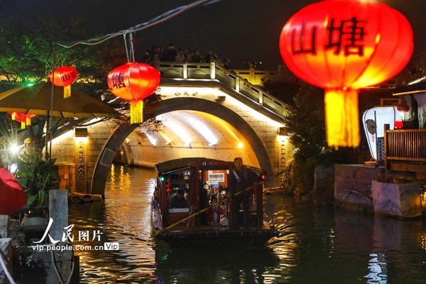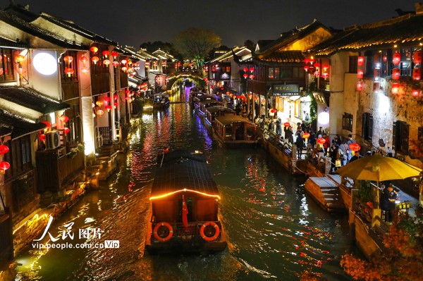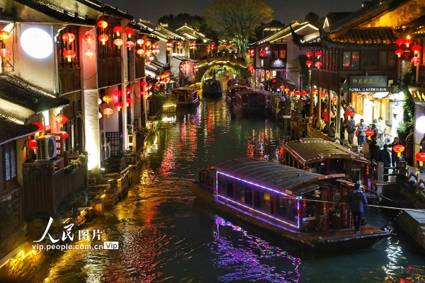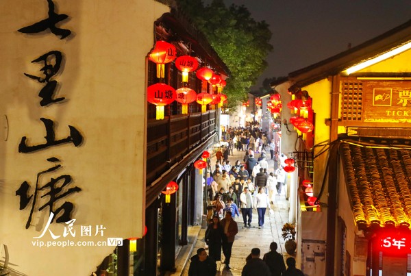 2025年12月10日,江苏苏州姑苏区山塘街灯火璀璨,夜景如画,众多游客前来游览,感受七里山塘的夜色魅力。施柏荣摄(人民图片网)