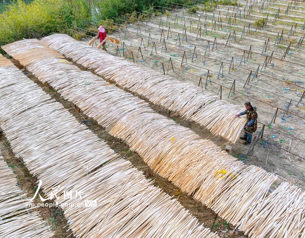 2025年12月16日,浙江省湖州市长兴县泗安镇师姑岗村,工人正在晾晒已加工好的毛竹条。
