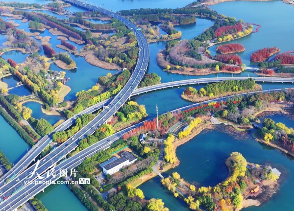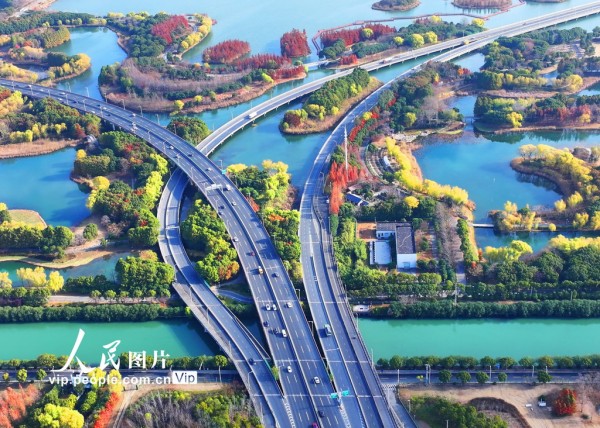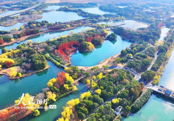冬至时节,空中俯瞰蓝天白云掩映下的江苏省苏州市虎丘湿地公园,层林尽染,色彩斑斓,构成了一幅壮美的生态湿地画卷。王建中摄(人民图片网)