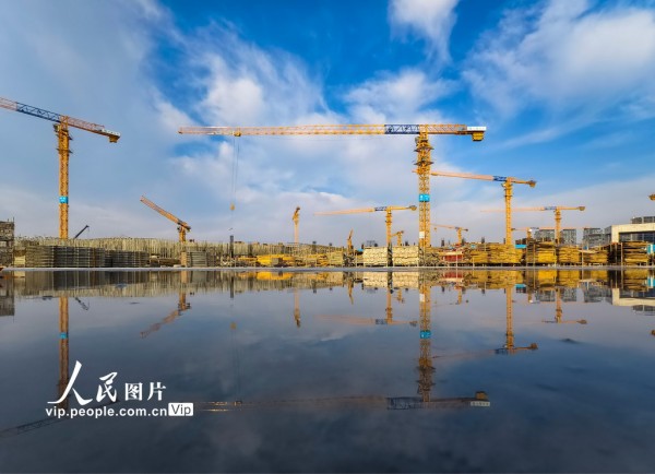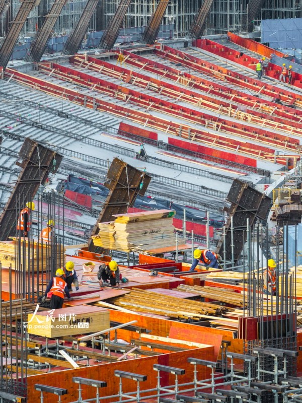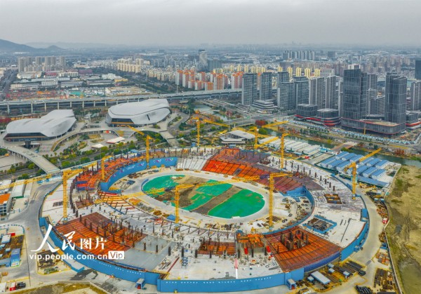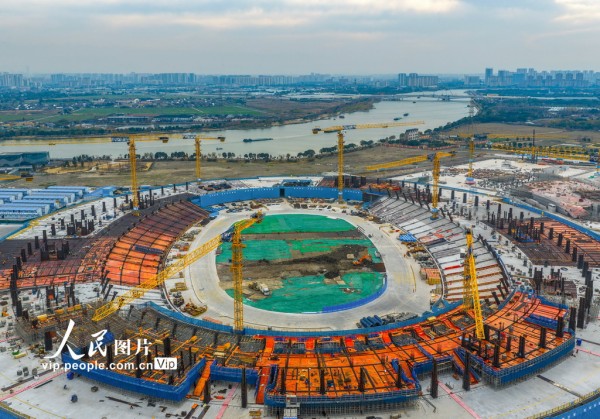 2025年12月23日,浙江省宁波奥体中心二期主体育场建设工地现场,建设工人抢抓良好天气,安全有序推进工程进度。胡学军摄(人民图片网)