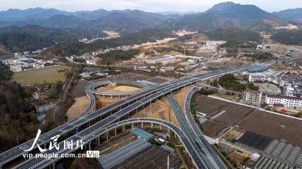 2025年12月23日,俯瞰浙江省金华市351国道浦江联盟至兰溪界的杨田周互通立交,车辆在桥面上有序行驶中。
