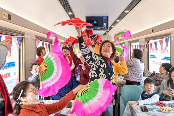 2025年12月28日,在黑龙江哈尔滨开往亚布力的Y999/998次“悠享龙江·银旅号”旅游列车上,随着演艺人员热情高亢的歌声,来自江苏、浙江、上海等地的240名游客开启跨年之旅。据悉,这是黑龙江开行的首趟冰雪环线旅游列车。原勇摄(人民图片网)