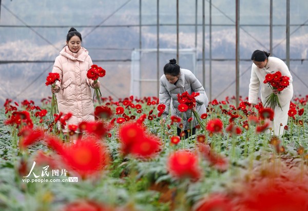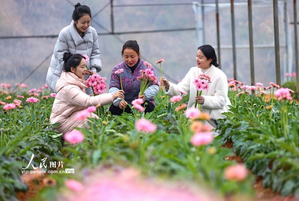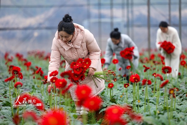 新年临近,贵州省铜仁市玉屏侗族自治县种植的非洲菊竞相绽放,吸引不少顾客前往现场购买采摘非洲菊,迎接新年的到来。胡攀学摄(人民图片网)