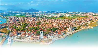 若是从空中俯瞰福建泉州南安市石井镇奎霞村,便会看见这样迷人的风景——一侧是蔚蓝的海水,一侧是连栋成片的红砖古厝,其间点缀青白色的石基、雪白的山花和绿色琉璃花饰,碰撞出一幅色彩鲜明的画卷。2023年,奎霞村被列入第六批中国传统村落名录。