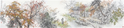 历时4年,我完成100多幅园林题材作品。用欧阳修《鉴画》中的8个字“萧条淡泊,闲和严静”去概括,我在画文人园林时想要体现“萧条淡泊”,绘制皇家园林时就要体现“闲和严静”,以此呈现二者不同的气象。创作中,抓住文人园林和皇家园林不同气质的表达很重要。欧阳修认为立意闲适宁静、意境深远的作品是最难画的,因为这种心境和意境是难以通过绘画直观展现的,需通过含蓄的手法表现深层精神境界。《满园诗境入画屏》以谐趣园为对象,皇家园林的恢弘富丽化为具有历史积淀的红色立柱,画面大部分用淡墨呈现湖面、枯荷、远景中的亭台榭宇和树石茂林,远景所表现的意境将皇家园林固有的庙堂之高带入雅逸清新、闲和严静的气象中。相较而言,《雪映雅堂》从留园五峰仙馆内望向雪景中的叠石,纯墨色立柱与淡墨表现的叠石形成室内外的空间对比,叠石上笔墨中的线质,虚化了叠石的结构与造型,但又着意体现了笔墨细节,营造出文人园林意蕴深远与萧条淡泊的气质。