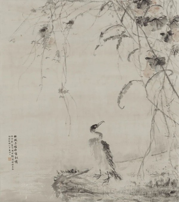 指画探索是刘万鸣先生“求意”路上的重要突破。他深入研究了清代高其佩等指画大家的传统,但并非简单复刻,而是追求“指墨虽异,其理一同”。他认为“指画能破笔之樊笼,得笔难至之天趣与古拙。” 以指代笔,线条更显生辣奇崛,如万岁枯藤;用掌泼墨,墨色愈发浑厚华滋,尽显苍润。在此单元,《蕉荫栖禽》等指画新作,既保留了指墨特有的“偶发”与“生涩”,又处处体现其严谨的构图控制与精微的造型意识,实现了“拙中寓巧”“乱中见整”的高难度平衡。这一探索,不仅拓展了其花鸟画的语言边界,更体现了一位成熟艺术家在深入传统堂奥后,勇于打破工具局限、直指艺术本真——“意”的至高境界。
