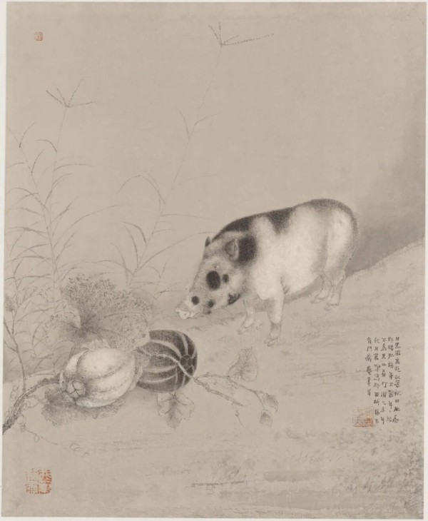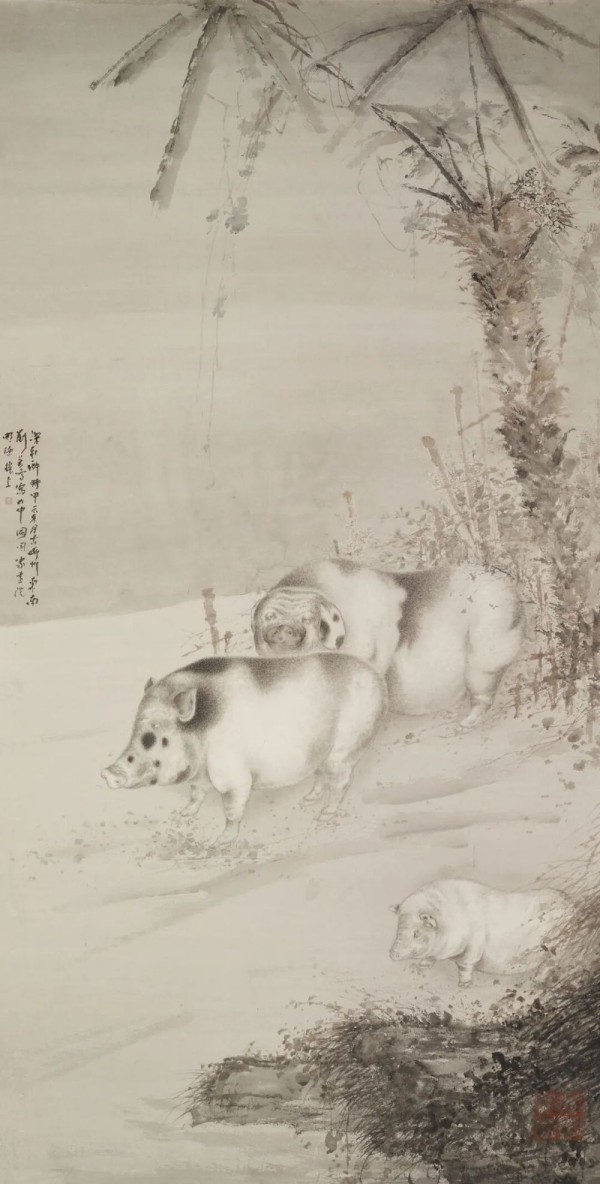 他秉持生活是艺术的源泉,常年深入乡村田野,以画笔反复推敲自然中一草一木的鲜活气息。那些憨态可掬的猪群、灵动矫健的春鸟、静谧沉思的人物,皆源于对生活的赤诚观察。在他眼中,万物皆有灵性,无论是珍禽猛兽还是家禽野草,都能在笔墨中绽放出平等的审美价值。