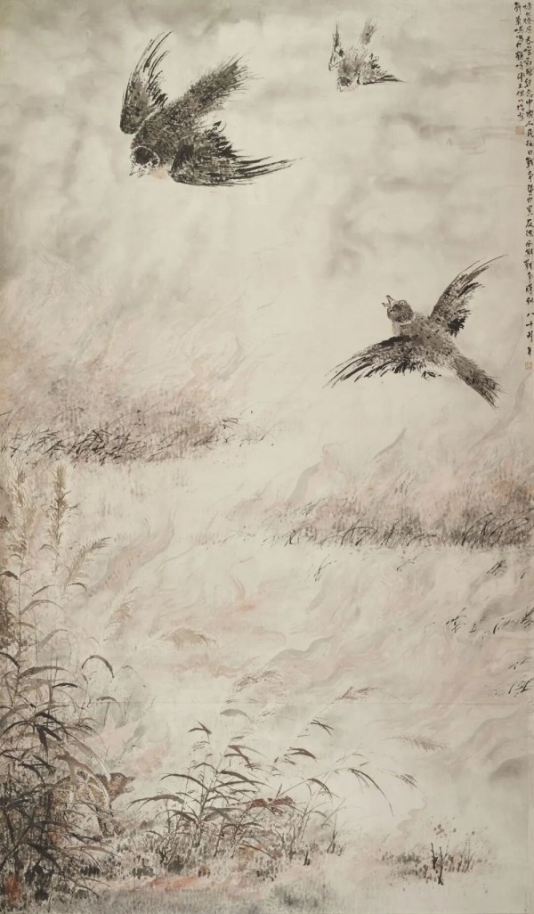 而当传统笔墨遇见时代精神,万鸣先生的创作更显其文化担当与时代回响。他一方面汲取传统滋养创作,另一方面又将现代造型圆融地融入其间,实现“致广大而尽精微”的创造性融合,在禽鸟飞影与山石垂藤间传递着万物和谐的生态哲思。