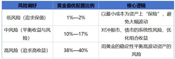 “黄金是调料不是主食。”鲁政委用一个生动的比喻,点明黄金在资产配置中的定位。他将投资者分为三类风险偏好,并给出了对应的黄金配置比例: