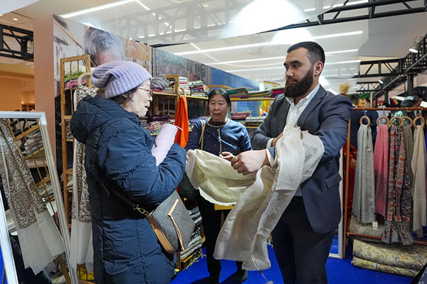 2月4日,在“共享大市场·出口中国”2026年首场活动暨北京国际精品荟的进口商品推介区,参观者(左)购买展出的乌兹别克斯坦围巾。