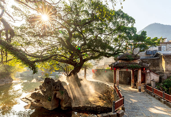 清晨的阳光穿透喀斯特峰丛,洒在广西壮族自治区贺州市黄姚古镇的青石板路上,带龙桥的石拱倒映在姚江水面,与岸边升起的炊烟交织成画。