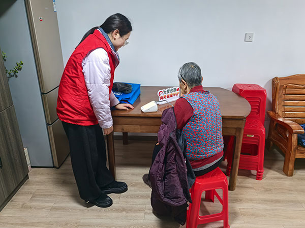 为全方位覆盖老人生活与健康需求,社区党总支通过推行“向阳健康守护”项目,以“健康敲门行动”为核心,推出“1+N”精准服务套餐。“1”为基础健康检测,志愿者携血压仪、血糖仪等设备,为3名日访户每日探访,为1名周访户、7名月访户定期监测,累计入户126人次,建立动态健康档案,实时跟踪血压、血糖、心率等关键指标。“N”涵盖多元个性化服务:为慢性病老人提供随访与用药指导,为行动不便老人开展“入户探访+便民理发”并送健康手册;排查用电用气隐患、叮嘱防滑防摔,保障居家安全;通过唠家常疏导心理,推广“三减三健”理念,实现身心双重关爱。