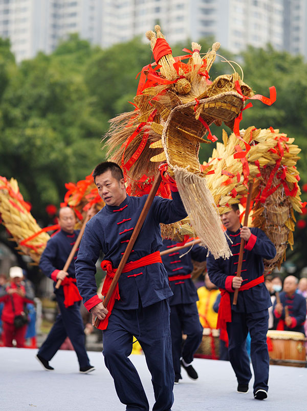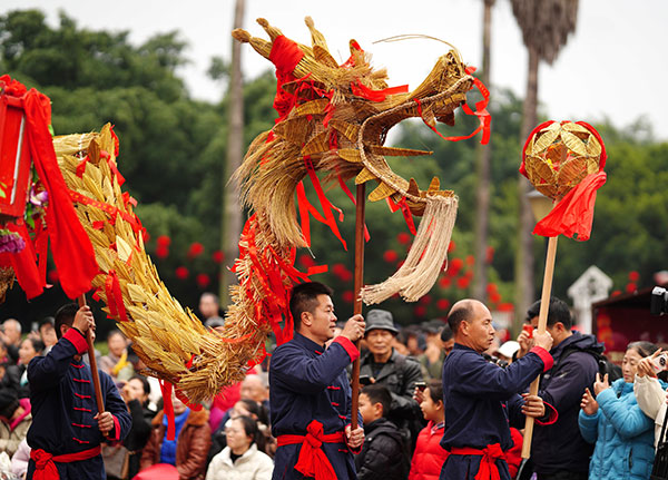 2月6日,在广西桂林市灵川县灵川镇滨江广场,人们在表演舞草龙,喜迎马年新春。