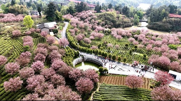 阳春四月,四川省开江县讲治镇镇龙寺村双飞茶园里,一垄垄茶树泛起新绿,粉色的樱花竞相绽放。微风拂过,落花飘进茶行间,游客穿行其中,不时驻足留影。这座占地近千亩的茶园,正以花为媒,迎来一年中最热闹的时节。