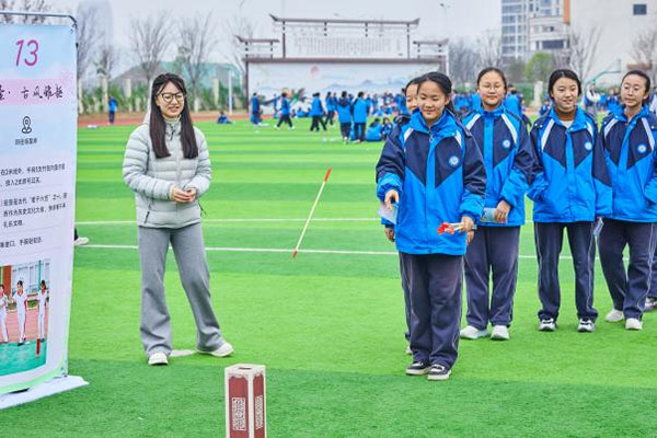 活动现场,学校精心搭建了多元化运动体验平台,设置速度挑战、球类竞技、传统趣味、团队协作、特色体验五大活动区域,涵盖短跑、球类运动、投壶、集体长绳、防溺水实践等丰富项目。冯杰手把手向学生传授铅球投掷技巧,讲解运动发力要点与安全注意事项,学生们全员参与、踊跃体验,在奔跑、协作、挑战中感受运动乐趣,在汗水与欢笑中锤炼团队意识,实现了“人人参与运动、人人收获成长”的活动初衷。