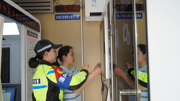 “大爷您别急,咱们一步步来。”70多岁的王大旺在自助区门口张望,女警李思怡迎上去,一边手把手教他操作,一边端上一杯热水。对于照片不符、签注失败等异常情况,女警们也会介入协调。站内常备热水、充电器、雨伞、老花镜和几块糖果。