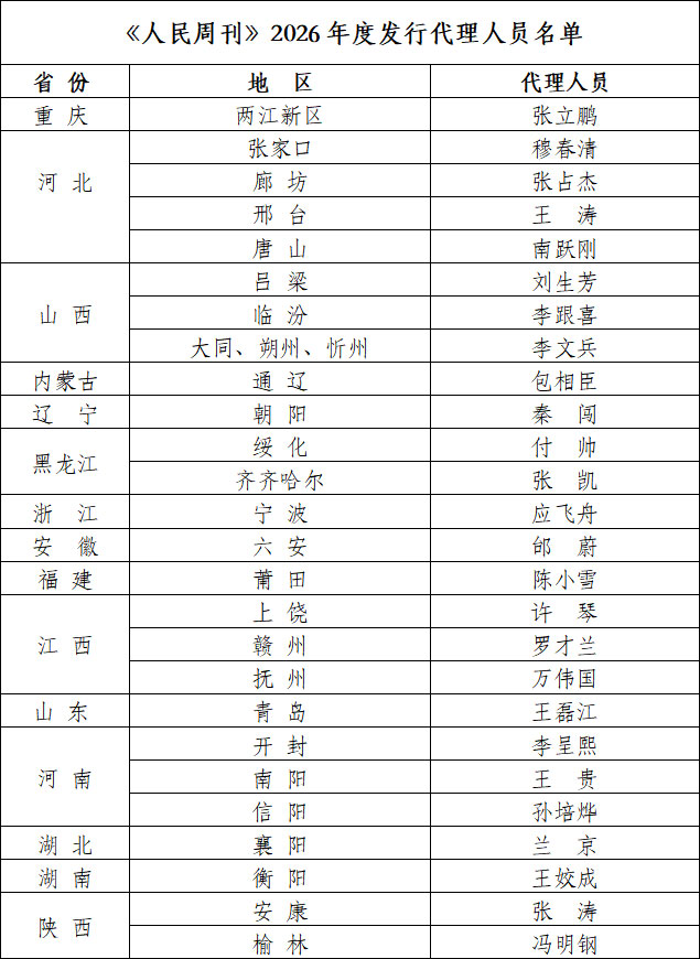 《人民周刊》是由人民日报社主管、人民日报出版社主办的时事综合类期刊,努力打造“人民日报现代传播体系的窗口、主流思想舆论融合传播的平台、宣传社会主义核心价值观的阵地”。为严格规范周刊的发行工作,促进可持续发展,现将2026年度发行代理人员名单在人民周刊网上进行公布。具体如下: