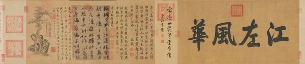 《伯远帖》原是王珣写的一封信笺,整幅作品开卷后,由右至左分别为乾隆皇帝御书的引首:“江左风华”。前隔水御书:“家学世范,草圣有传。宣和书谱”。后御题:“唐人真迹已不可多得,况晋人耶!内府所藏右军快雪帖、大令中秋帖,皆希世之珍。今又得王珣此幅,繭纸家风,信堪并美!几余清赏,亦临池一助也。御识。”又御识:“乾隆丙寅春月,获王珣此帖,遂与快雪中秋二迹并藏养心殿温室中,颜曰三希堂,御笔。又识。”在一幅小尺幅的法书前撰写如此之多的御题,足见乾隆皇帝对此件珍宝的喜爱。王珣书法本体释文:“珣顿首顿首,伯远胜业情期群从之宝。自以羸患,志在优游。始获此出意不剋申。分别如昨永为畴古。远隔岭峤,不相瞻临。”