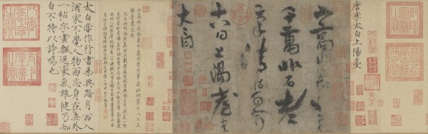 后隔水有乾隆皇帝御题,后有宋徽宗赵佶的御题,作为宋徽宗的亲笔书法,也非常珍贵。此帖经清安岐《墨缘汇观》《石渠宝笈·初编》等书有著录。