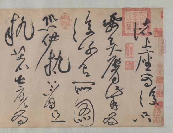 黄庭坚的《诸上座帖》在创作上受到了唐代怀素草书的很大启发,也能看到张旭风格的影子。作者以悬腕运笔之法完成全卷,整幅作品气势苍浑,笔法肆意老辣,字形结体奇特,奔放洒脱,作者卓越的书艺跃然纸上。作者通过如此奇特的草书笔法,将其心中的淤塞之气抒发出来,由此开创了中国艺术史上的狂草新篇章,是其晚年力作,中国书法珍品中的瑰宝。《钤山堂书画记》《清河书画舫》《式古堂书画汇考》《庚子消夏记》《石渠宝笈·初编》等书著录。
