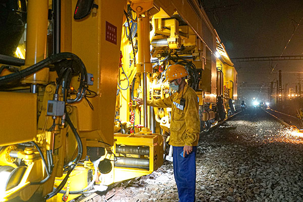 图为作业人员指挥捣固车作业。宋彤波 摄