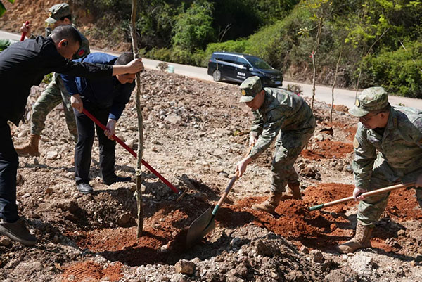 近日,广东省平远县人武部组织干部文职、职工和新兵们到长田镇官仁村开展植树活动,军地携手栽下“从军树”,厚植国防情,用实际行动传承爱绿植绿护绿的优良传统,为生态文明建设再添新绿。
