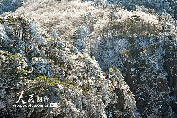 2026年1月7日,安徽黄山风景区迎来新年首场雾凇景观,漫山银装,玉树琼枝,晶莹的冰晶缀满松梢,吸引游客观赏拍摄。水从泽摄(人民图片网)