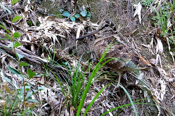 1月10日清晨,保护区气温逼近0℃,监测人员在一处山坳口发现一只横穿公路的丘鹬。这只体长35厘米的“矮胖精灵”悄然伏在毛竹林下,与枯黄落叶巧妙融为一体,尽显惊人的伪装本领。“它先回头观察片刻,确认安全后才起身觅食。”监测人员回忆道:“可惜一辆小车驶过,丘鹬受惊后,便迅速消失在视野中了。”