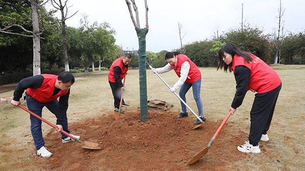 3月3日,广西贺州市区的爱莲湖公园人声鼎沸,贺州市党政机关工作人员、志愿者、企业代表等数百人齐聚于此,挥锹铲土、扶苗培土,9个劳动区内200多株菩提树、栾树等树苗在春风中挺立,为这座“世界长寿市”增添了勃勃生机。