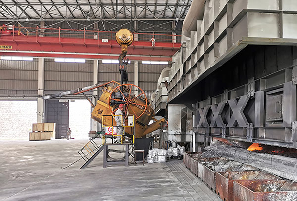 滚烫的铝液从保温炉中倾泻而出,通过专用抬包车,在十五分钟内直达下游企业生产线。