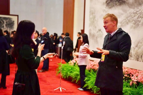 3月4日,十四届全国人大四次会议在人民大会堂举行新闻发布会。在熙攘人群里,记者邂逅中国政府友谊奖最年轻获奖者、中国日报社高级记者——来自美国的聂子瑞(Erik Nilsson)。他在华生活工作20年,已是第九次参与中国两会报道工作。“聂子瑞”这个中文名,是他结合发音和文化寓意所取:是为君子、传承之意,寄寓祥瑞、美好的心愿。