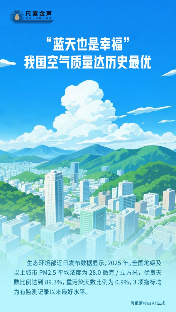 生态环境部近日发布数据显示,2025年,全国地级及以上城市PM2.5平均浓度为28.0微克/立方米,优良天数比例达到89.3%,重污染天数比例为0.9%,3项指标均为有监测记录以来最好水平。