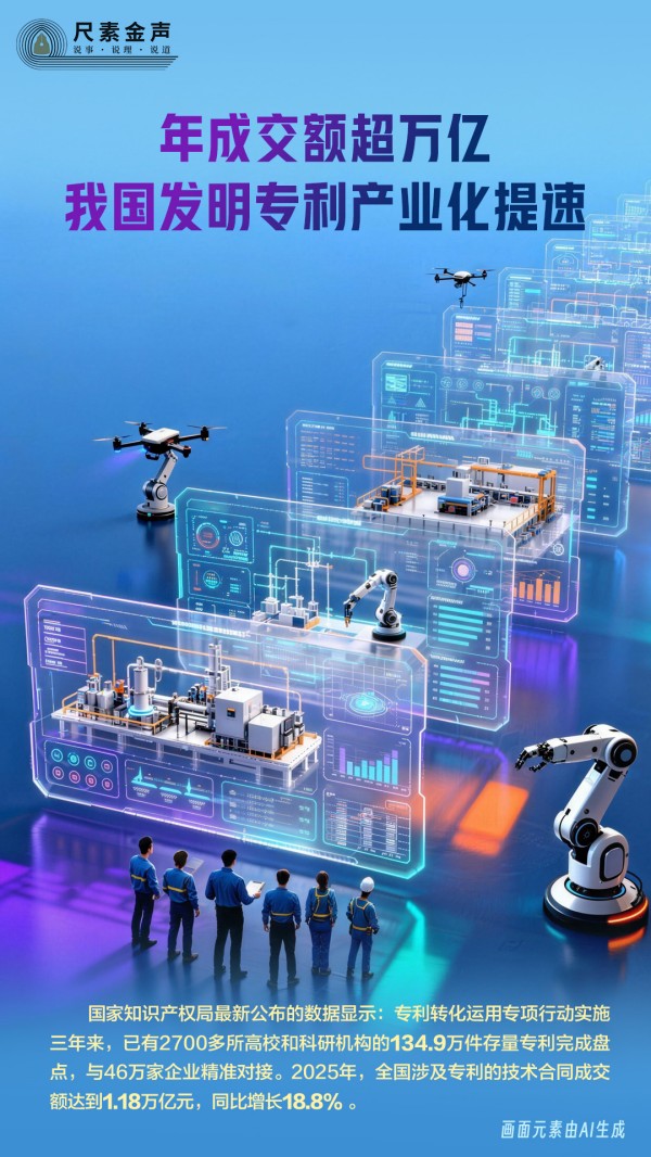 国家知识产权局最新公布的数据显示:专利转化运用专项行动实施三年来,已有2700多所高校和科研机构的134.9万件存量专利完成盘点,与46万家企业精准对接。2025年,全国涉及专利的技术合同成交额达到1.18万亿元,同比增长18.8%。