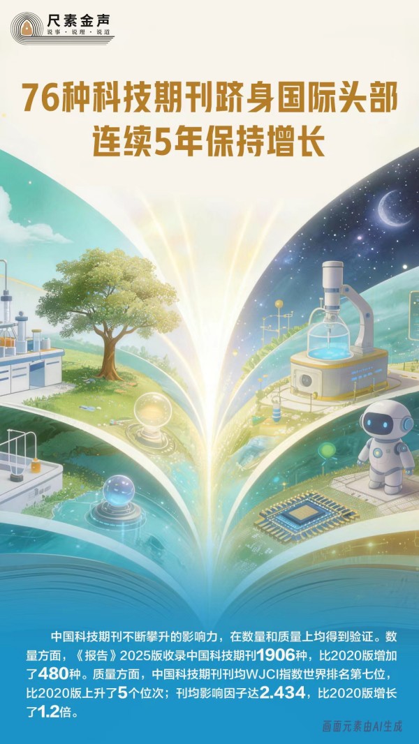 日前,中国科协发布的《科技期刊世界影响力指数(WJCI)报告》(以下简称《报告》)2025版显示,学科排名位列全球前5%的中国科技期刊达76种,是2020版的9.5倍。头部期刊数量连续5年保持增长,在部分领域已达到国际顶尖水平。