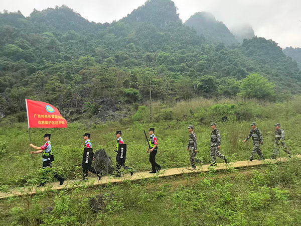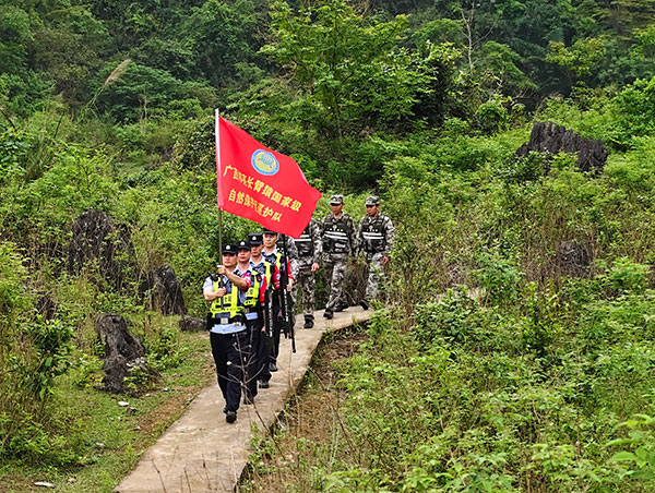 “千难万难,百南不难!”百色边境管理支队百南边境派出所民警传承边防武警的红色基因,常年巡守48公里险峻边境线,面对毒蛇、蚂蟥和犯罪分子威胁从未退缩。辖区588号“天梯界碑”矗立峭壁,需攀上千级石阶才能抵达。“每一次巡逻都是对忠诚的考验。”教导员王光学说,民警们扛责守边,让五星红旗在边境之巅飘扬。
